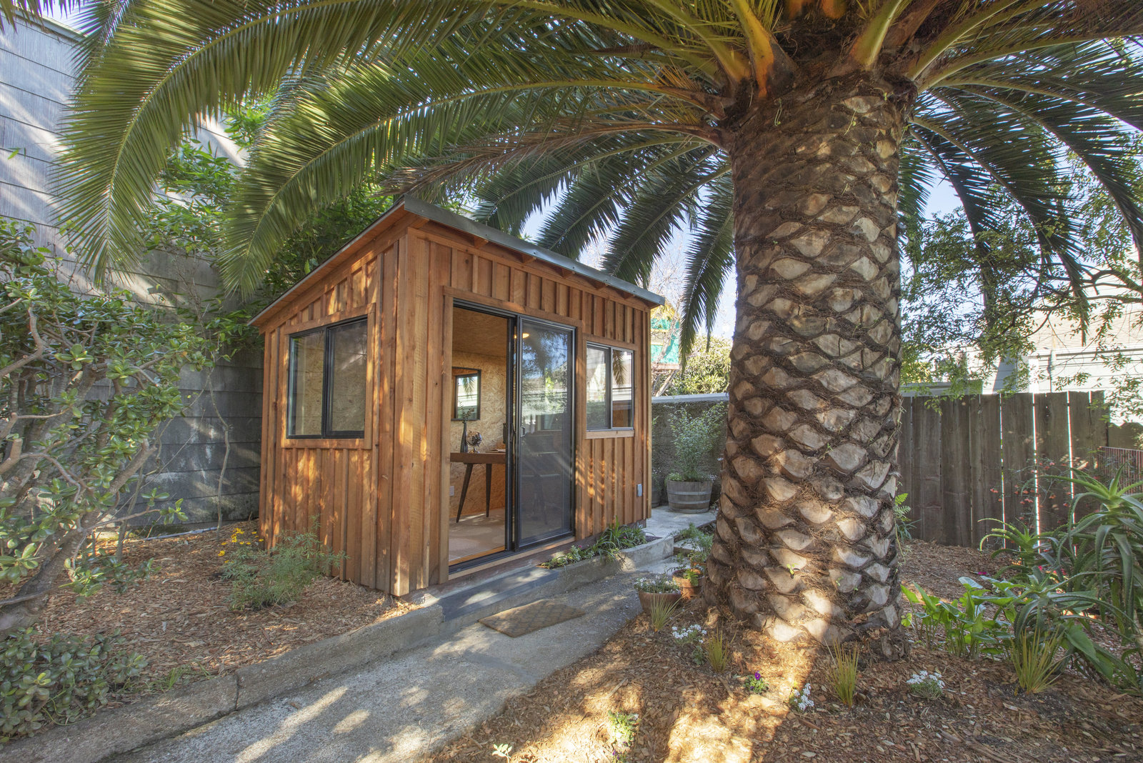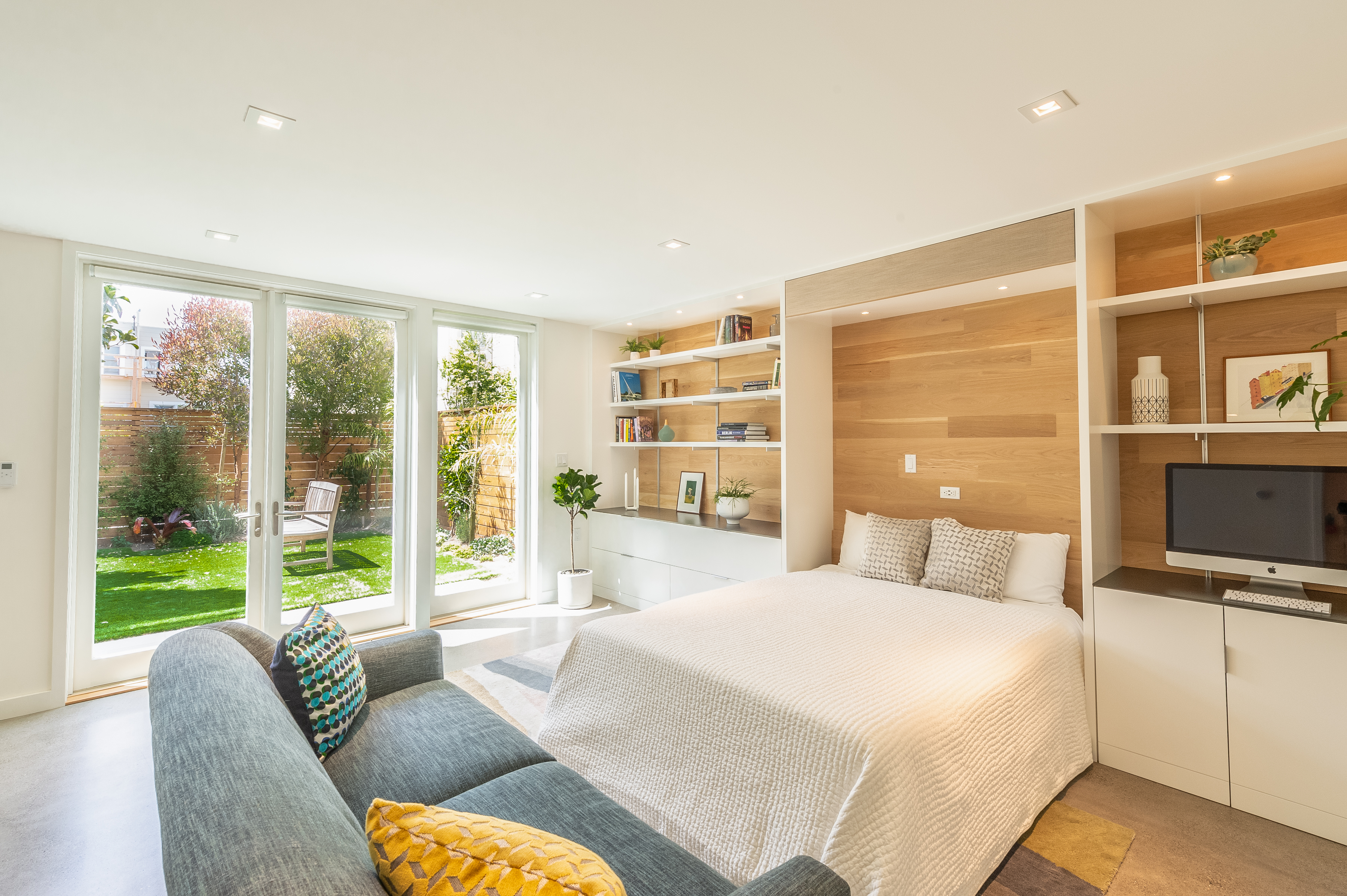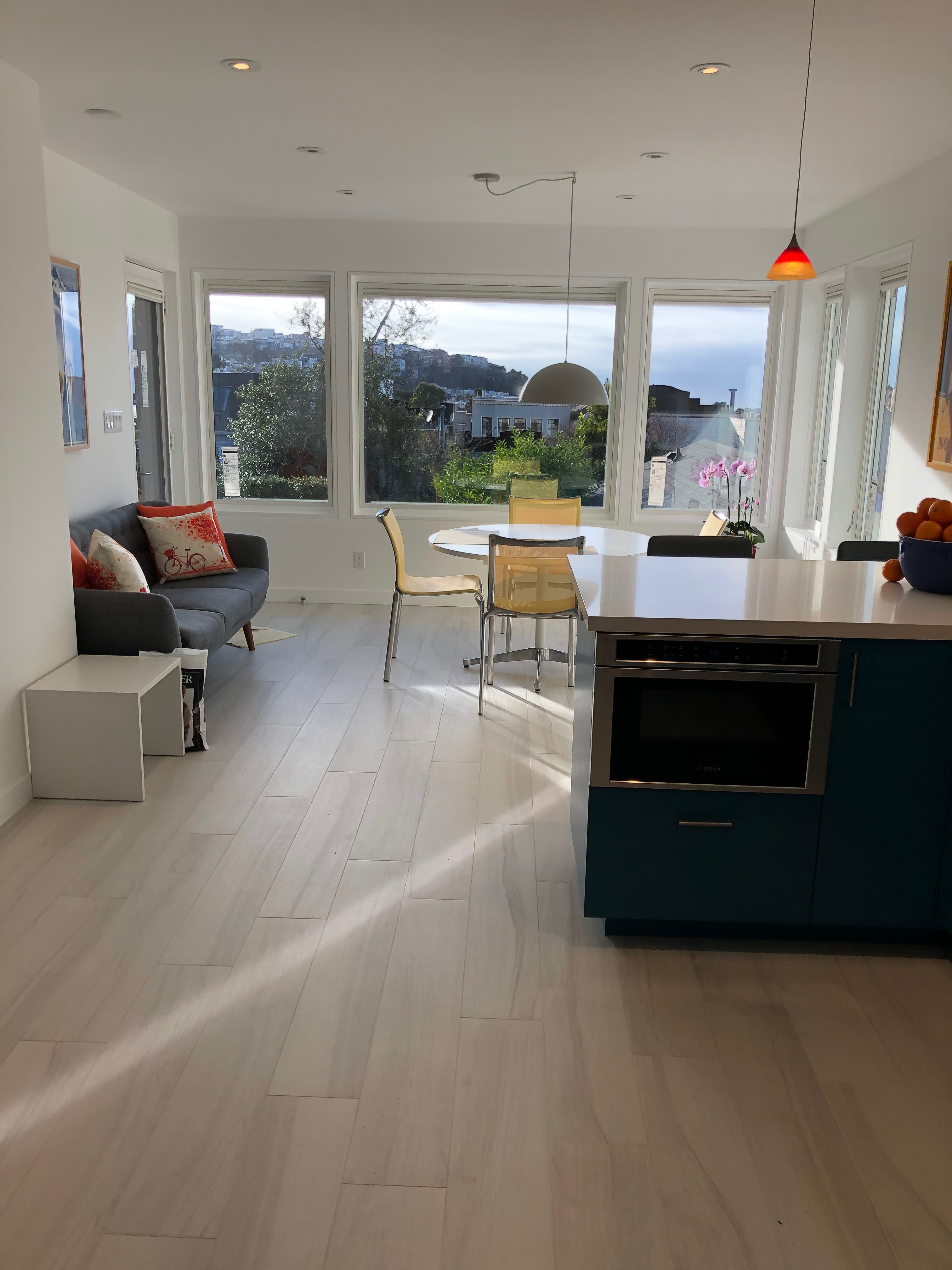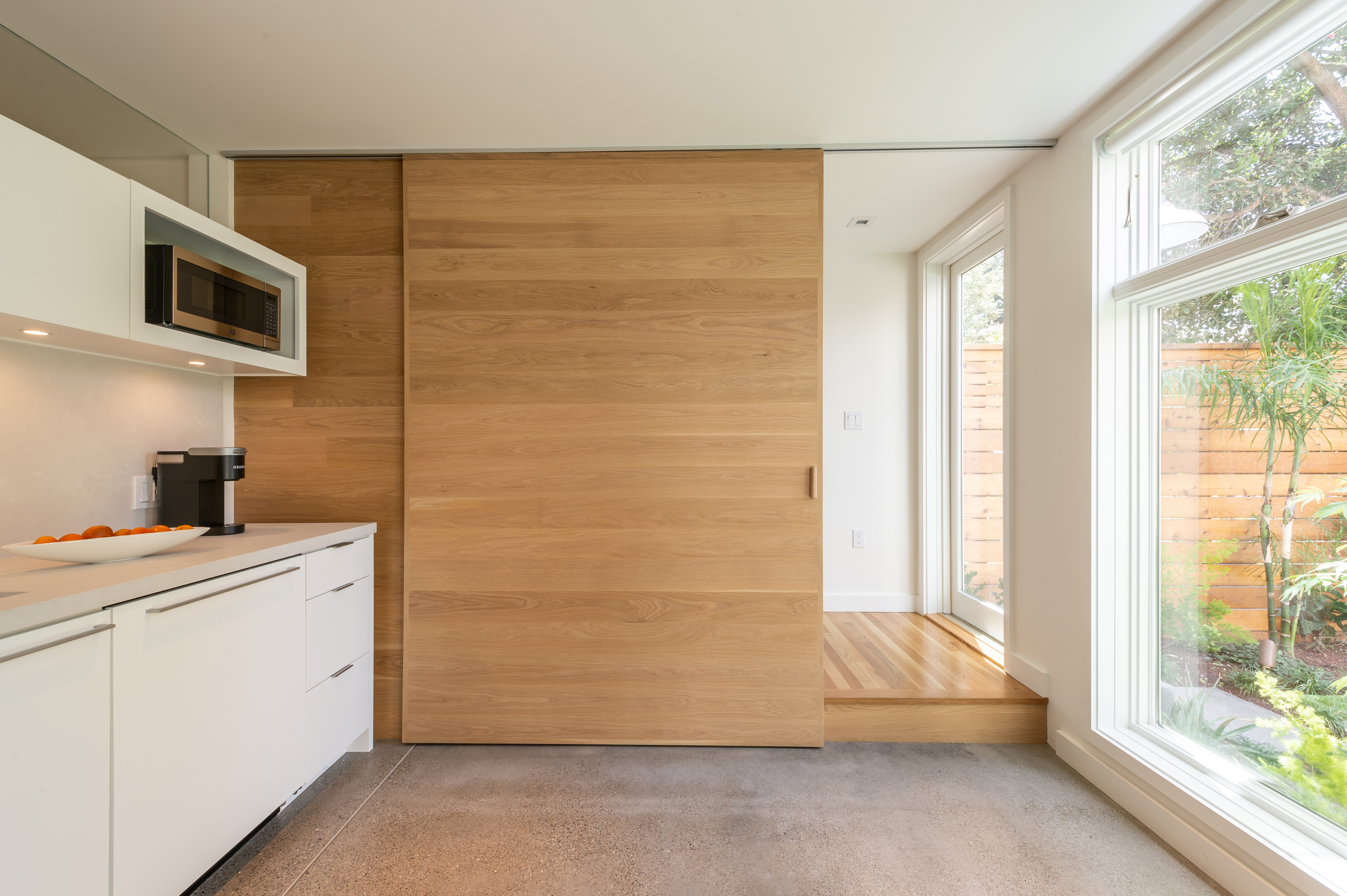 Ground floor suite with sliding partitionGround floor suite with Murphy bed downGround floor suite with Murphy bed upKitchen and SunroomKitchen with Caesarstone countertop and plank tile floorBathroom with transom window natural lightKitchen with pantry cabinets, wainscot, floral wallpaperRoof deck with Ipé decking and glass/stainless steel windscreenIpé deck with concealed fastenersIpé deck with existing handrail updated with redwood lattice infillWork from home Office/StudioBedroom with radiant heat, bead board ceilingCedar closet with shoe shelf
